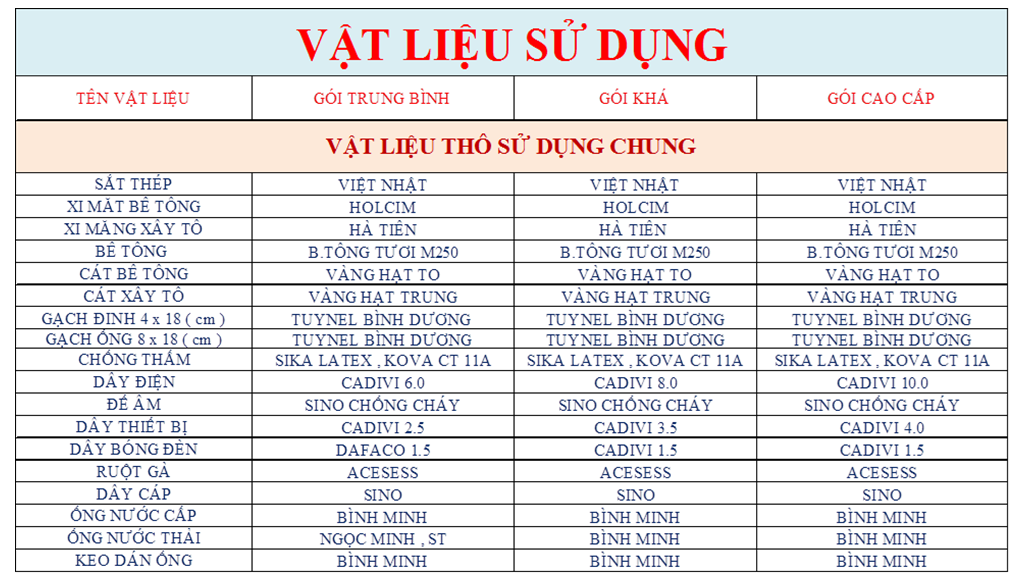 ĐƠN GIÁ THI CÔNG PHẦN THÔ – GÓI TIÊU CHUẨN: 3.300.000 VND/m2 ÁP DỤNG CHO NHÀ PHỐ 1 MẶT TIỀN