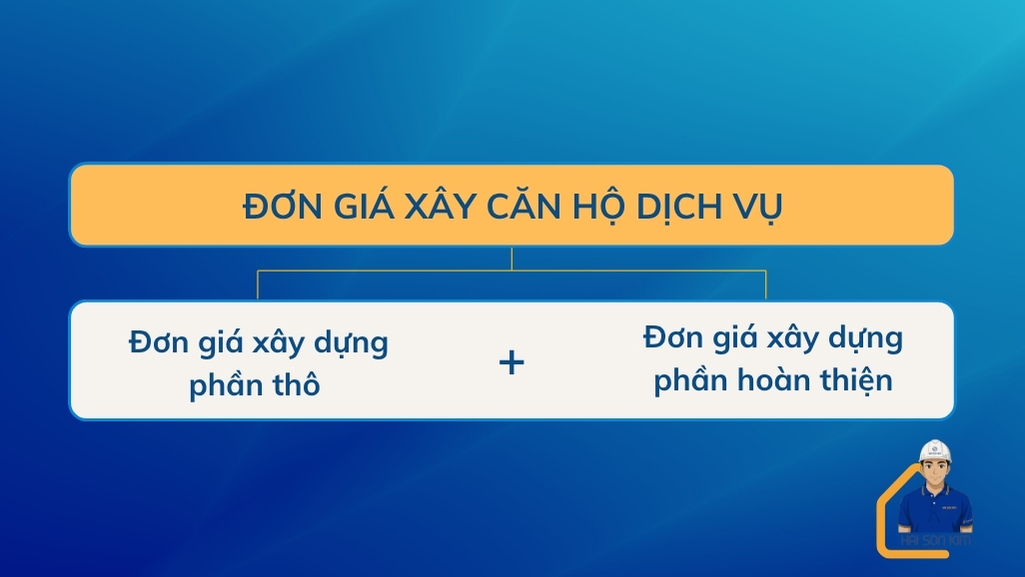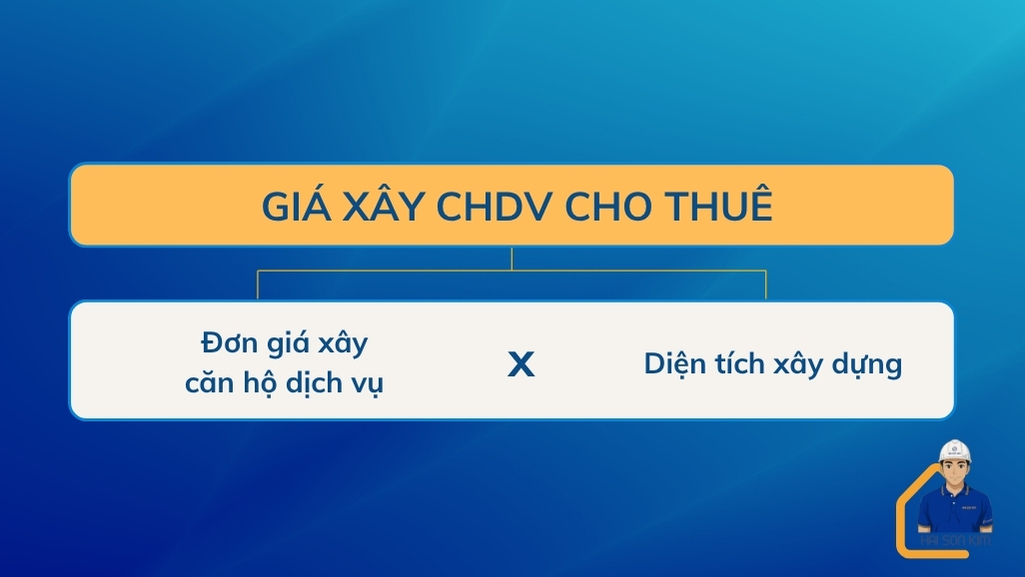 Đơn giá xây căn hộ dịch vụ cho thuê được tính dựa trên giá xây dựng phần thô (kết cấu) và giá xây dựng phần hoàn thiện. Mức giá này chưa bao gồm chi phí thiết kế cũng như nội thất trang trí bên trong. Công thức dưới đây cũng được hầu hết các công ty xây dựng căn hộ dịch vụ cho thuê áp dụng cụ thể như sau: