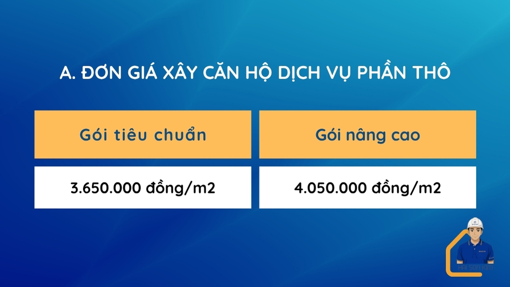 - Đơn giá: Phần thô = 3.650.000 đ/m²; Hoàn thiện cơ bản = 2.500.000 đ/m²