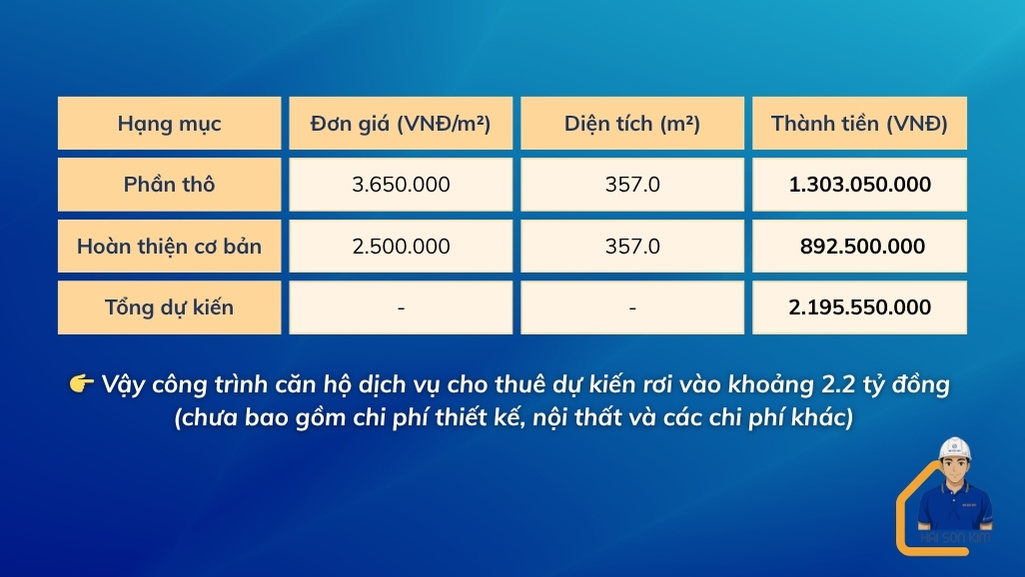 Đơn giá xây căn hộ dịch vụ cho thuê bao nhiêu?
